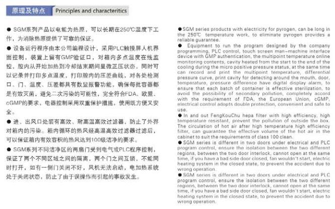 The company has accumulated long-term experience in designing and manufacturing various electric sterilization boxes, digesting and absorbing the advantages of similar foreign products, and combining with China's national conditions, carefully designed and developed the GM100-series dry heat sterilization (except heat source) box (device ). The device meets the requirements of FDA, GMP and US Federal Standard 209E, and provides reliable assistance for GMP transformation and FDA verification in the domestic pharmaceutical industry.
