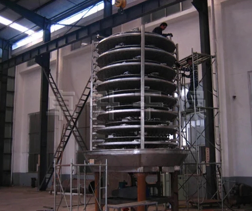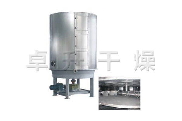 wet material is continuously fed from the feeder to the first layer of the drying tray on the upper part of the dryer. The raking arm with the raking leaves is used for the slewing motion to make the squat arm rotate the spurs continuously. The material flows along the exponential spiral through the surface of the drying tray, the material on the small drying tray is transferred to the outer edge, and falls to the outer edge of the large drying tray below the outer edge. On the large dry tray, the material moves inward and falls from the middle. The material is dropped into a small dry tray as follows. The size of the drying tray is alternately arranged up and down, and the material is continuously flowed through the entire dryer. A heating medium is introduced into the hollow drying tray. The heating medium is in the form of saturated steam, hot water and heat transfer oil. The heating medium enters from one end of the drying tray and is led out from the other end. The dried material falls from the last layer of the drying tray to the bottom layer of the casing, and is finally transferred to the discharge port by the rakes. The moisture fraction escapes from the material and is discharged by the moisture discharge port provided on the top cover, and the moisture of the vacuum type tray dryer is discharged by the vacuum pump port provided on the top cover. The dry material discharged from the bottom layer can be directly packaged. By adding fin heater, solvent recovery condenser, bag filter, dry material back mixing mechanism, induced draft fan and other auxiliary machines, it can improve its drying production capacity, dry paste and heat sensitive materials, which can be easily recycled. Solvent and can perform pyrolysis and reaction operations.